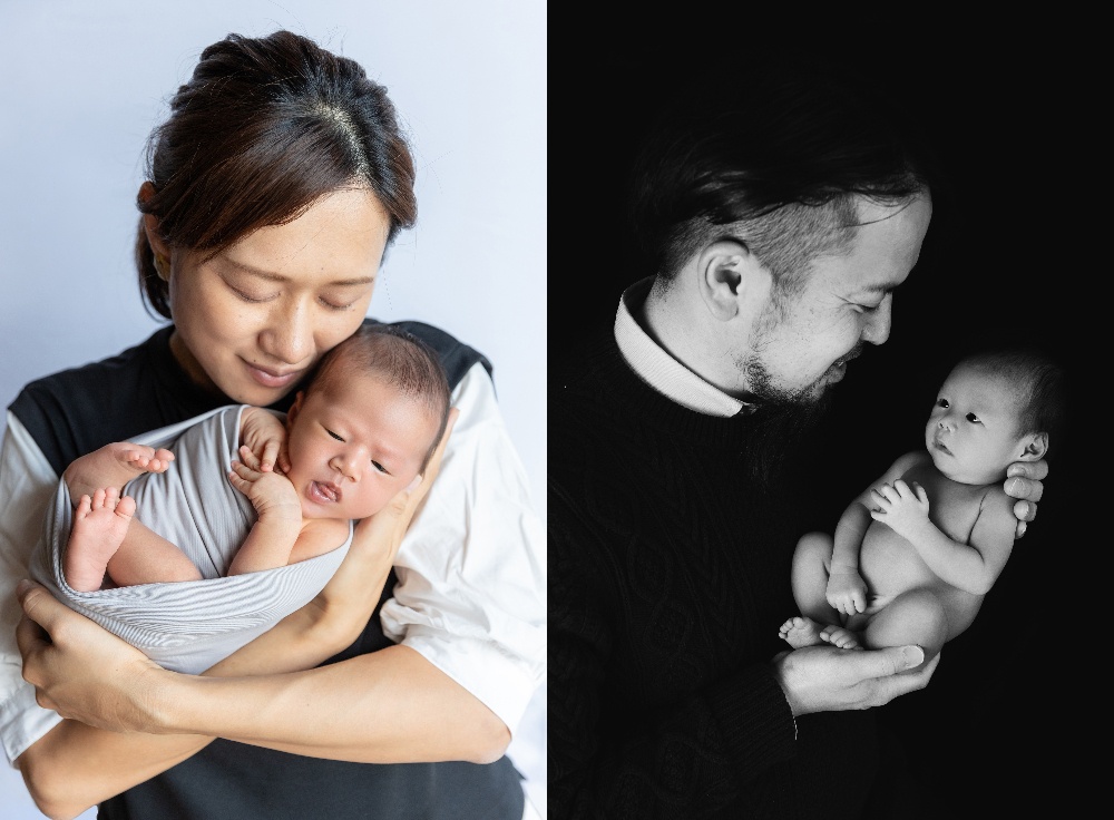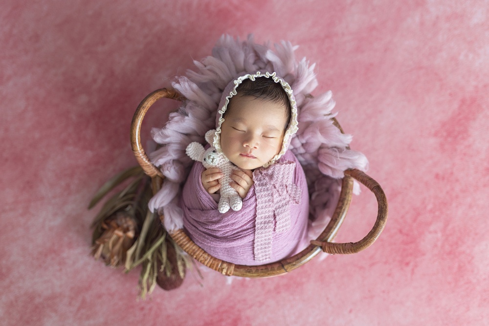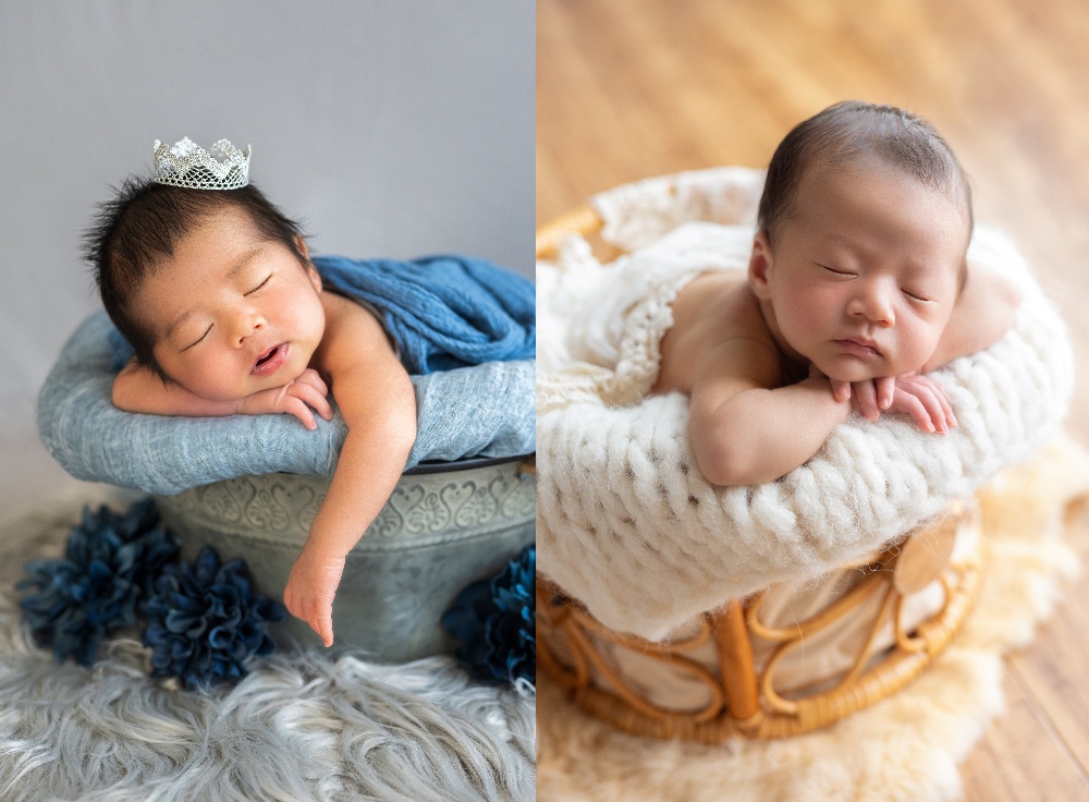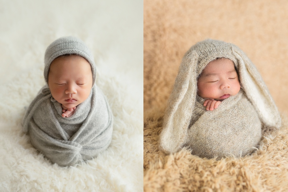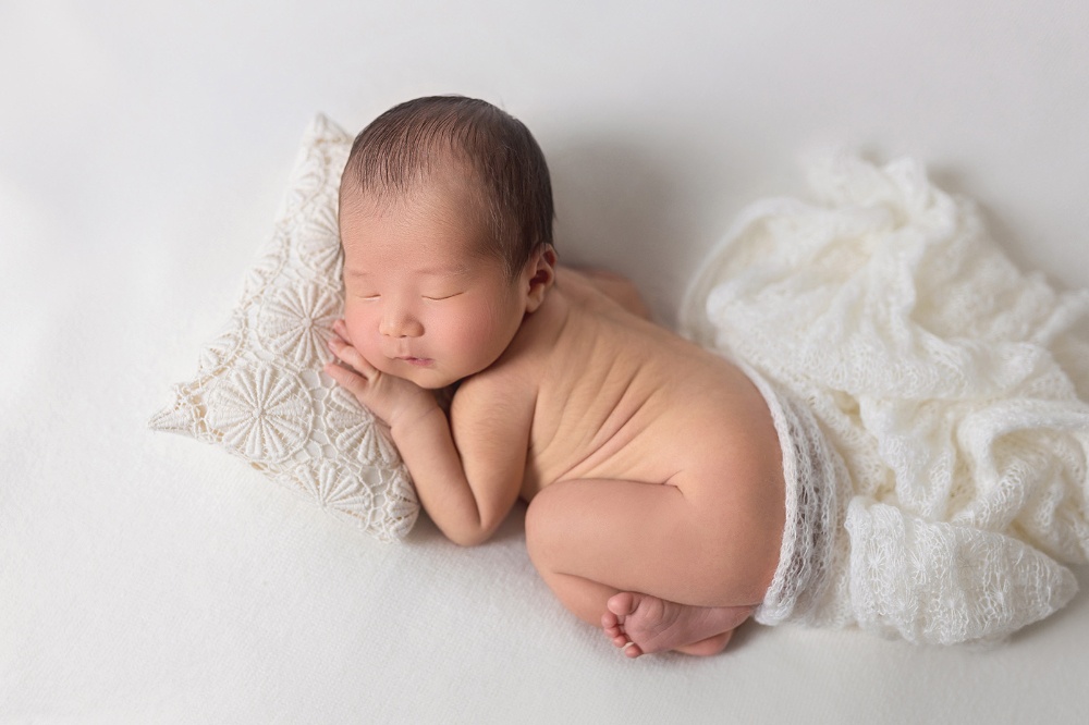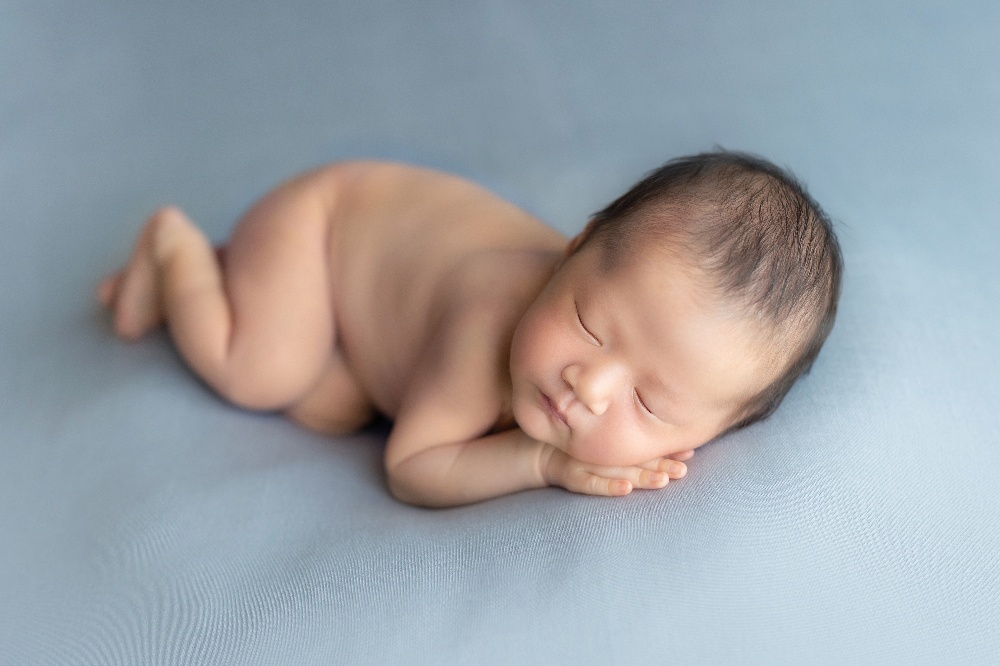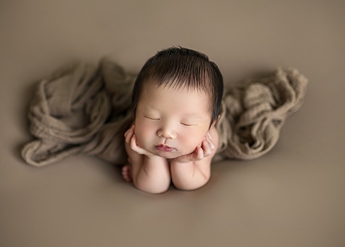 フロッギーポーズ(頬杖ポーズ)は、2枚の写真を合成&加工し、支えている手を消すことにより完成するポージングとなります。難易度の高いポージングでもあり、例えリクエスト頂いても赤ちゃんの状態により出来ないこともあるので、その場合は別のポージングへ変更させて頂きます。